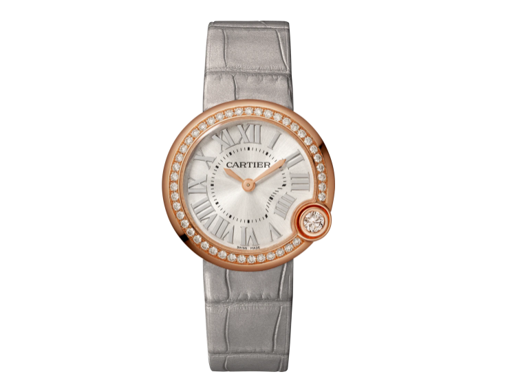 من مجموعة Ballon Blanc de Cartier الخاصة بعلامة كارتيه انتقينا لك هذا الموديل المصنوع من الذهب الوردي المرصع بالألماس حول المينا.