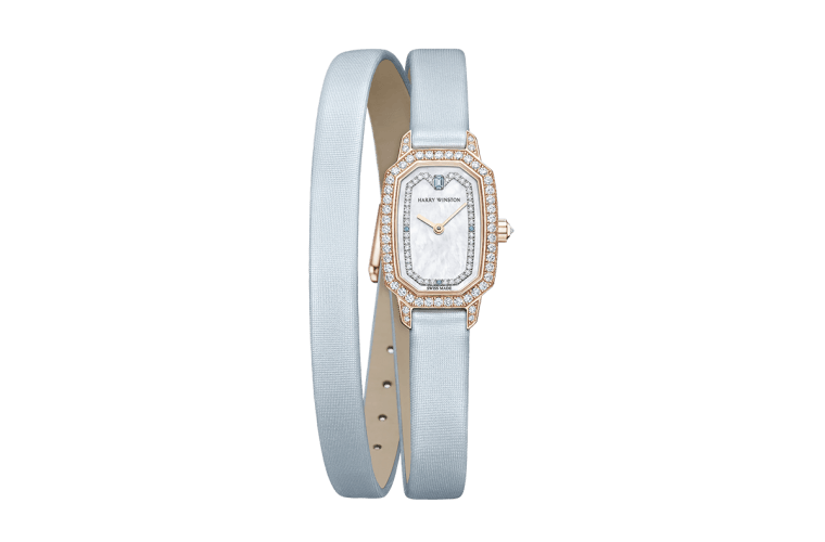 إليك هذه الساعة الخاصة بمجموعة Emerald الخاصة بعلامة هاري وينستون والتي تتألق باللون الأزرق الفاتح.