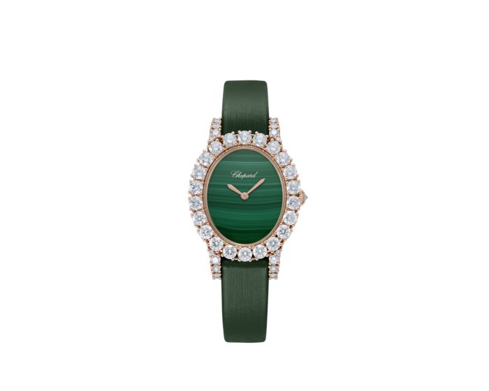نقترح عليك هذا الموديل الملون بالأخضر البارد من شوبارد والتي تقدمها لنا العلامة من الذهب الوردي المرصع بالألماس بقطع بقصات دائرية.