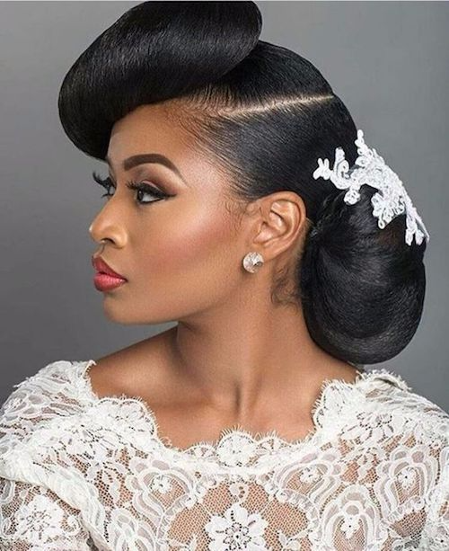 شعر مجعد مسرح في شكل شينيون منخفضة مع دبابيس شعر منفصلة في شكل ورود مثبتة في الخلف.