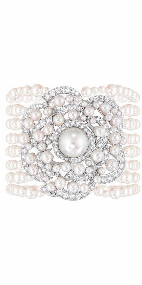 وبتصميم عريض، مزخرف وماسي نستعرض عليك هذا السوار الأنثوي الخاص بإبداعات بعلامة شانيل، ويأتيك مزين بحبات اللؤلؤ يحتوي أشكال ورود مع خيوط لؤلؤ بأسلوب آسر.