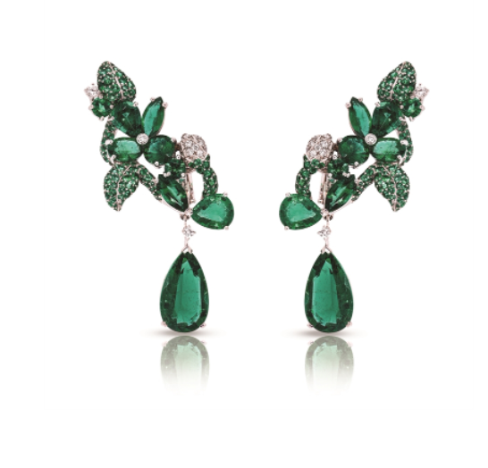 إليك هذه الأقراط الخاصة بمجوهرات دار فابرجيه والمصنوعة من الذهب الأبيض المزين بالكامل بأحجار الألماس الأبيض والزمرد، في تصميم مرح وعصري.