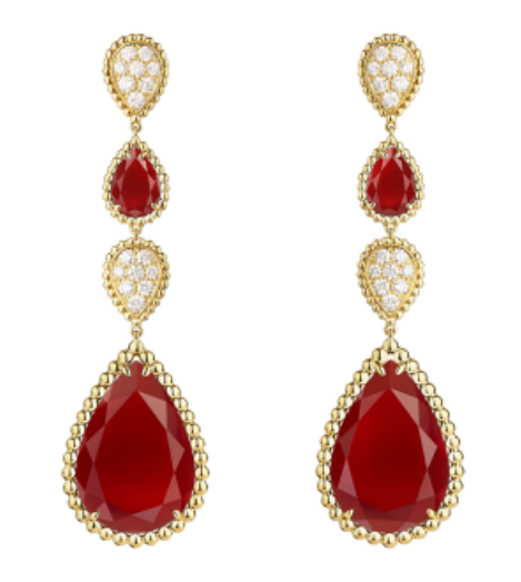 ومن مجوهرات بوشرون نقترح عليك هته الأقراط التي تتألق بالذهب الأصفر المرصع بأحجار الألماس والكارنيليان بقصات الإجاصة، في تصميم طويل وأنثوي.