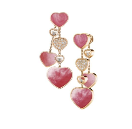 انتقينا لك من مجوهرات شوبارد هذا الموديل الذي يأتيك من الذهب الوردي المرصع بالألماس الأبيض وأم اللؤلؤ الوردي بأشكال قلوب، في تصميم أنثوي ناعم.
