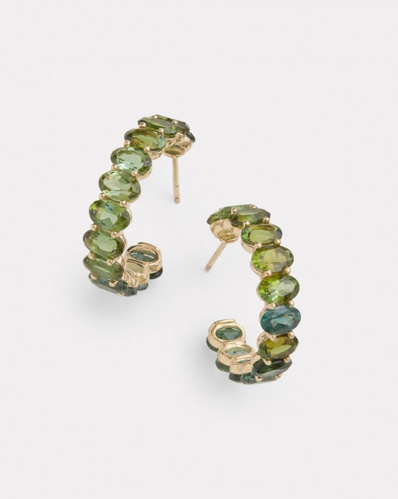 أقراط ذهبية بتصميم مفتوح مرصعة بقطع صغيرة من التورمالين الأخضر.