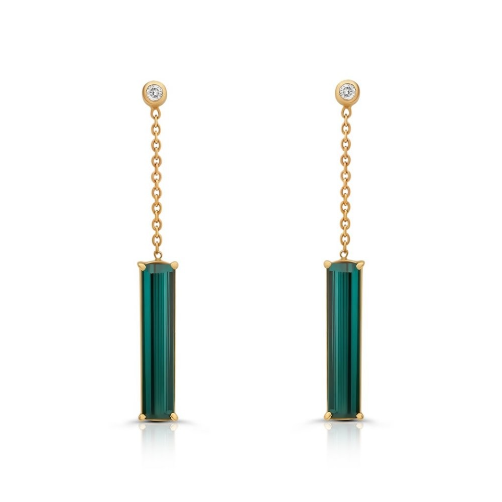 أقراط متدلية من الذهب الأصفر مع قطع من الماس الأبيض وتتدلى منها قطع مستطيلة من أحجار التورمالين الأخضر.