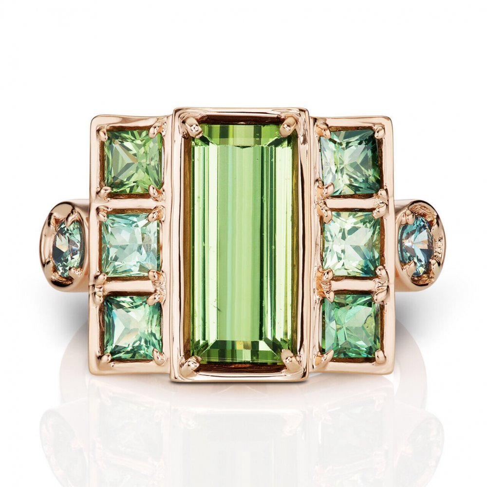 خاتم فخم من الذهب الوردي مزين بقطع من التورمالين الأخضر والياقوت الأخضر بقطع هندسية الشكل مربعة وأخرى بيضوية.