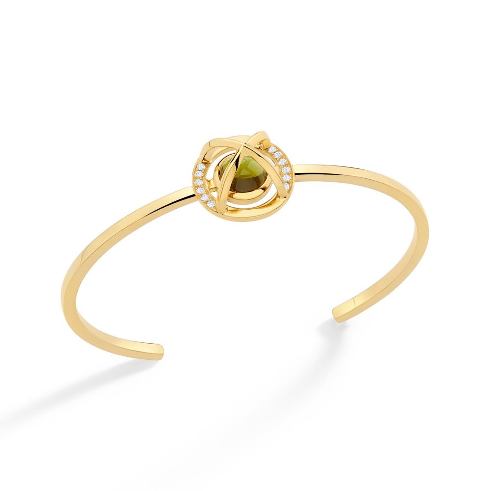 سوار بتصميم ناعم من الذهب الأصفر عيار 18 تتوسطها قطعة من التورمالين الأخضر بقطع كابوشون مع قطع من الماس الأبيض في إطار دائري.