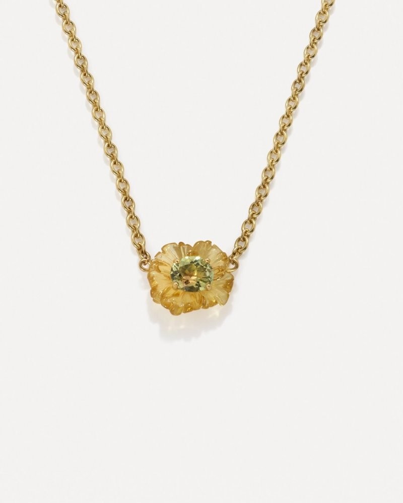 قلادة ذهبية تتوسطها موتيف في شكل وردة تتوسطها قطعة من التورمالين الأخضر.