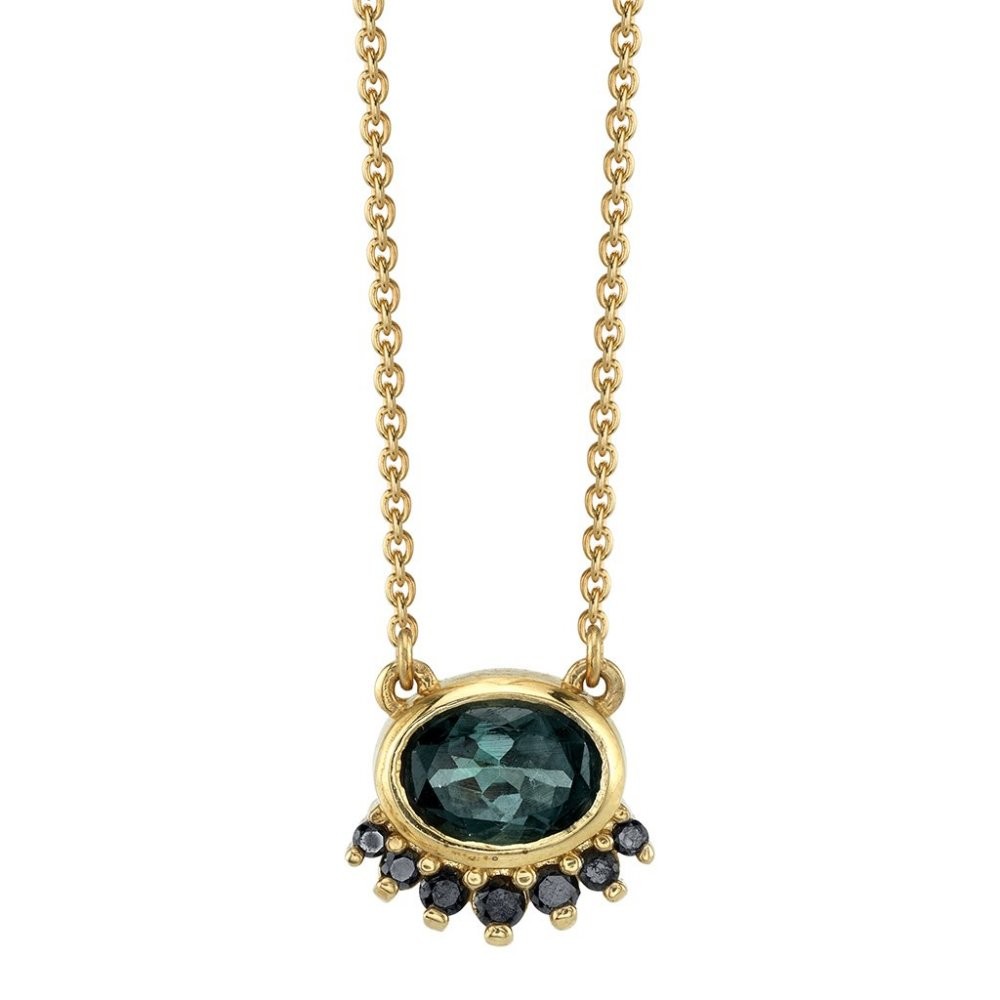 قلادة طويلة من الذهب الأصفر عيار 18 والبلاتين تأتي مزينة بموتيف بيضوي يحتوي على حجر الأوبال الأخضر مع قطع صغيرة من الماس الأسود.