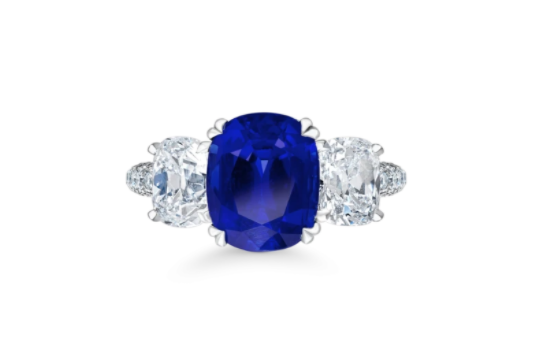 نستهل مجموعتنا من مجوهرات ديفيد موريس التي انتقينا منها هذا الخاتم الذي يتألق من بالألماس من الطرفين الجانبيين وتتوسطه قطعة كبيرة من الياقوت الأزرق.