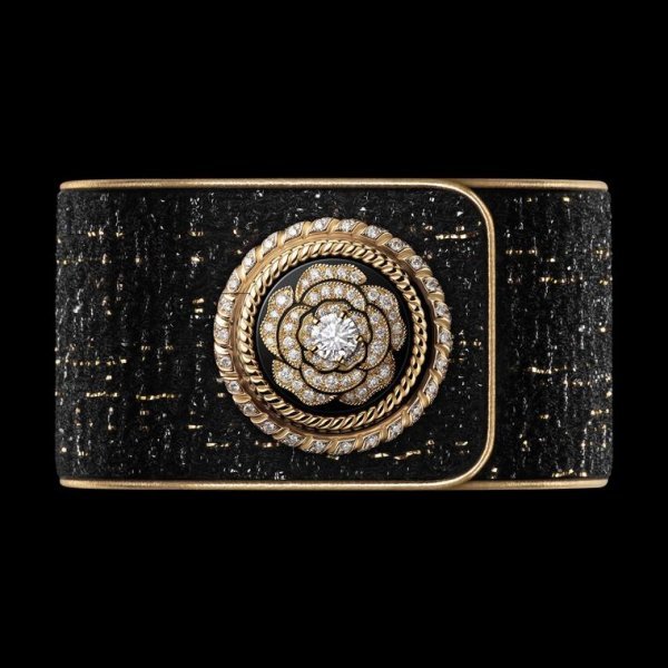 وبتصميم فخم ومميز استلهم من وحي أحزمة وأزرار تصميمات أزياء علامة شانيل نقدم لك هذه الساعة التي صنعت من الذهب الوردي المزين بالألماس والتويد مع موتيف زهور الكاميليا.