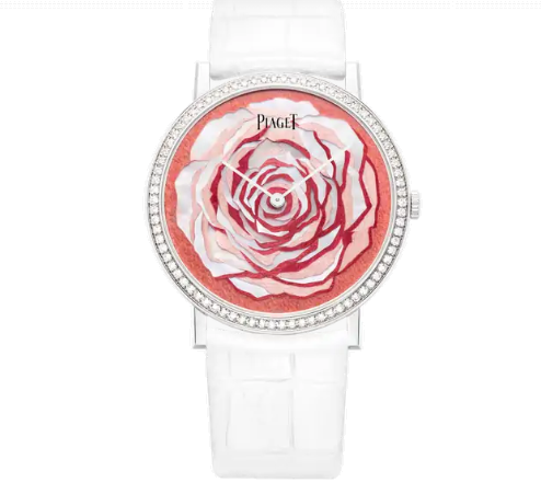 من ماركة غراف نقترح عليك هذا الموديل ذو اللون الزهري الفاتح، وتقدمه لنا العلامة من الذهب الأبيض الذي يتزين بالألماس حول المينا التي زينت بأشكل زهور، في تصميم مفعم بالأنوثة الأنيقة.