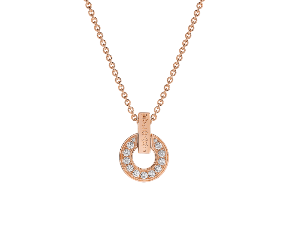 ومن بولغري إليك هذا العقد المصنوع من الذهب الوردي والمزين بقطع دائرية من الألماس في المنتصف والتي تحيط باسم العلامة.