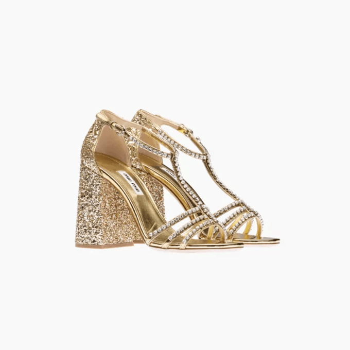 حذاء بتصميم مبتكر، حيث يأتي في شكل صندل بخيوط مرصعة بحبات من الراين الأبيض البراق، الصندل يأتي بكعب عريض الشكل ومرصع بالغليتر باللون الذهبي.