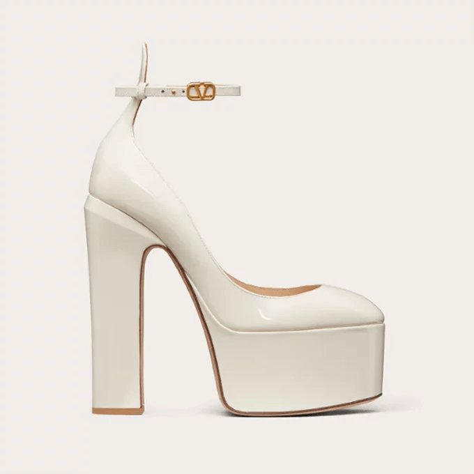 حذاء بلاتفوروم من الجلد اللامع باللون الأبيض الكريمي مع كعب عالي مربع، الحذاء يأتي مع حزام كاحل وإبزيم يحمل شعار العلامة.
