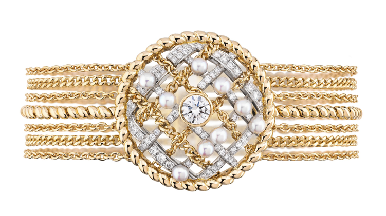 ومن مجوهرات شانيل نقترح عليك هذا الموديل الأنيق الذي يأتيك من الذهب الأبيض والأصفر والمزين بالألماس واللؤلؤ، في تصميم فاخر من وحي أقمشة التويد.