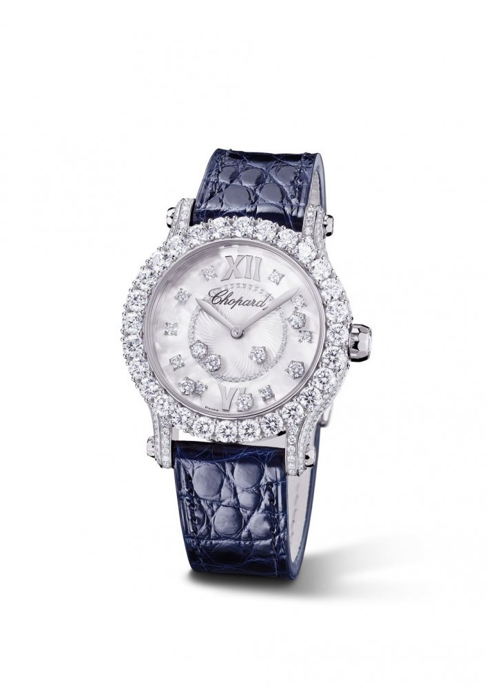 نقدم لك هذه الساعة الخاصة بعلامة شوبارد والتي تتألق من الذهب الأبيض الذي يتلألأ بالألماس الذي يزينه بقطع بارزة مع سوار أزرق داكن.