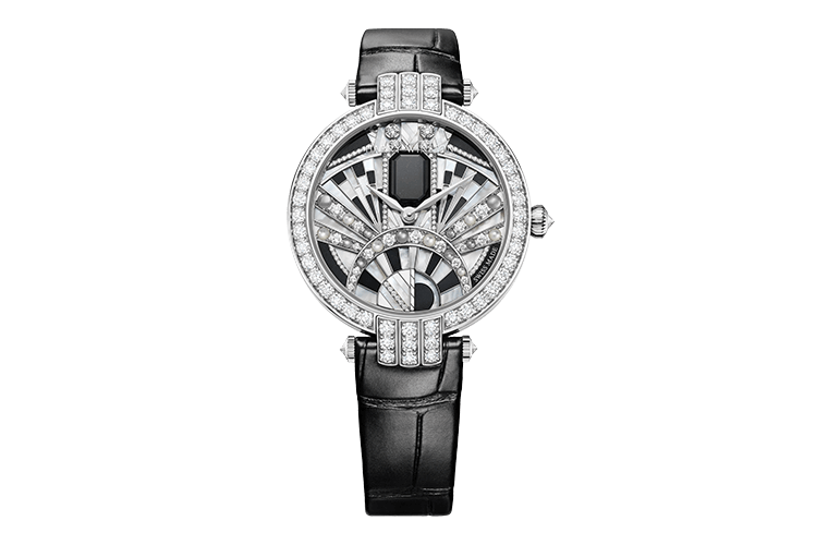 ومن مجوهرات هاري وينستون اخترنا لك هذه الساعة التي تقدمها لنا العلامة من الذهب الأبيض الذي يتزين بالألماس حول المينا في داخله مع سوار باللون الأسود.