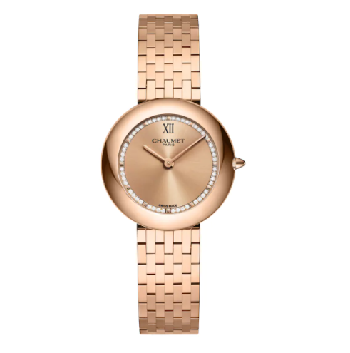 نستعرض عليك هذه الساعة التي تأتيك من اصدارات ماركة شوميه، وصنعت من الذهب الوردي بالكامل الذي يزينه داخل المينا قطع صغيرة من الألماس.