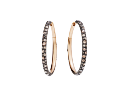 نقدم لك من مجوهرات بوميلاتو هذه الأقراط الـHoops التي تأتيك من الذهب الوردي المرصعة بقطع صغيرة من الألماس البني بالكامل، في تصميم راقي وأنيق.