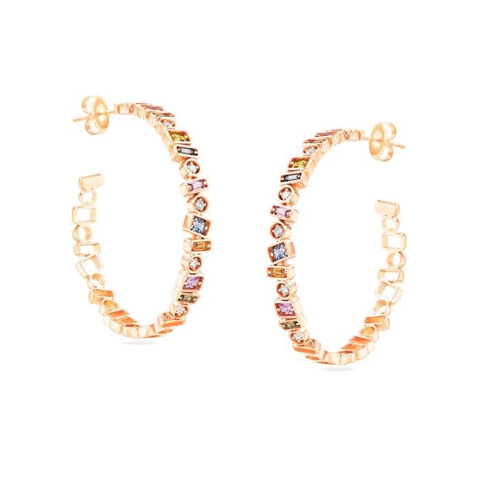 ومن مجوهرات سوزان كالان انتقينا لك أقراط hoops هذه والمتألقة من الذهب الوردي المزين بالألماس والياقوت الملون بألوان زاهية، في تصميم عصري رائع.