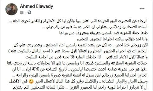 ياسمين عبد العزيز لم تتلوى الرد على الشائعات، في المقابل قام زوجها أحمد العوضي بتوجيه رسالة “الرجاء من الجريدة التي أعتز بها وأكنّ لها كل الاحترام والتقدير تحري الدقه. السادة الصحفيين زملائي بيبعتولي أن هذا الخبر يرسل لهم من رقم دولي.. طبعا حملة التشويه ضد ياسمين معروفة ومعروف مين وراها”.