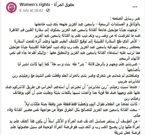 قامت صحيفة مصرية تهم المرأة بنشر خبر مفاده أن الممثلة المصرية ياسمين عبد العزيز متهمة بتعذيب خادمتها الفلبينية الأصل بعد أن توجهت بشكوى ضدها للسفارة الفلبينية في مصر.