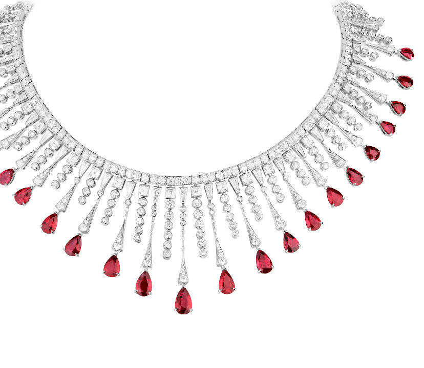 اليك هذا العقد الحاص بمجوهرات بوشرون والذي يأتيك من الذهب الأبيض المزين بالألماس وقطع الياقوت الأحمر.