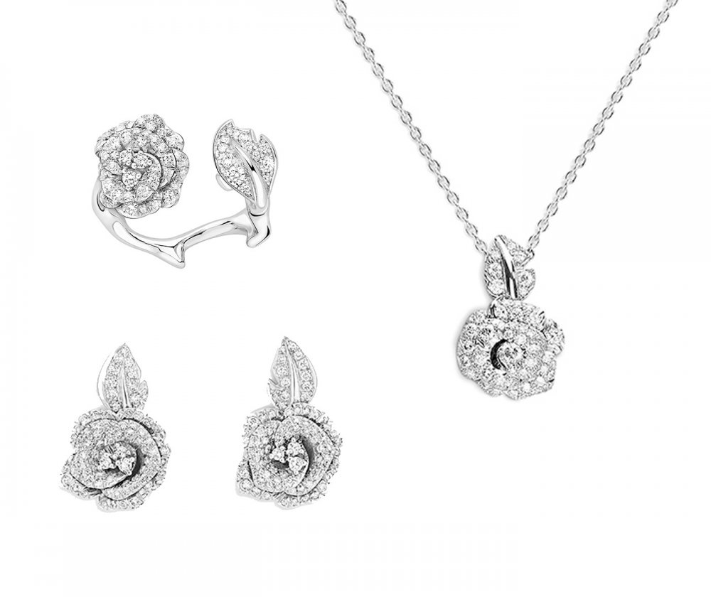 وأما هذا الطقم فهو يأتي بخاتم، سوار، عقد وأقراط تم صنعها من الذهب الأبيض الذي رصع بالألماس البراق،