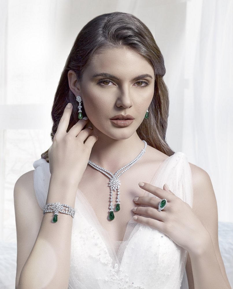 وقطع من حجر الزمرد الكولومبي بلونه الأخضر الجذاب، في تصميم أنيق ومميز.