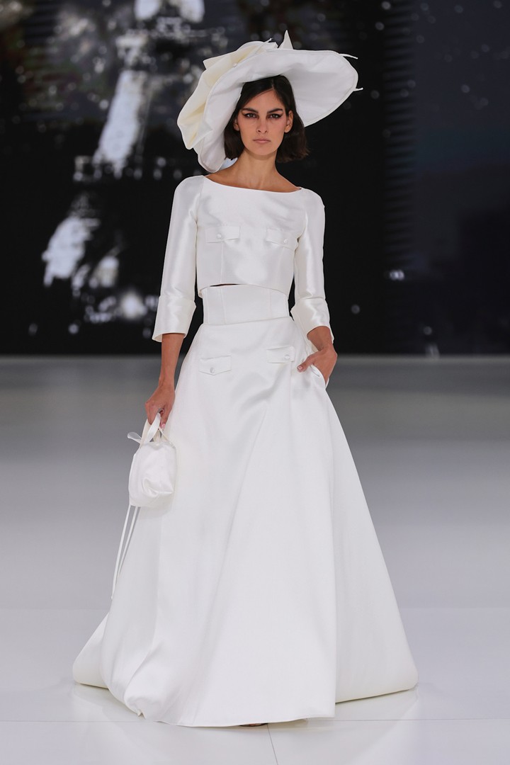الفساتين المكونة من قطعتين سيطرت بقوة على العروض، وبرز تصميم Cymbeline الذي جمع بين الأناقة والاحتشام. توب بثلثي كم مستوحى من السترات، وتنورة مزودة بجيوب، مع قبعة كبيرة بديلة عن الطرحة… مزيج فريد من الكلاسيكية والابتكار.