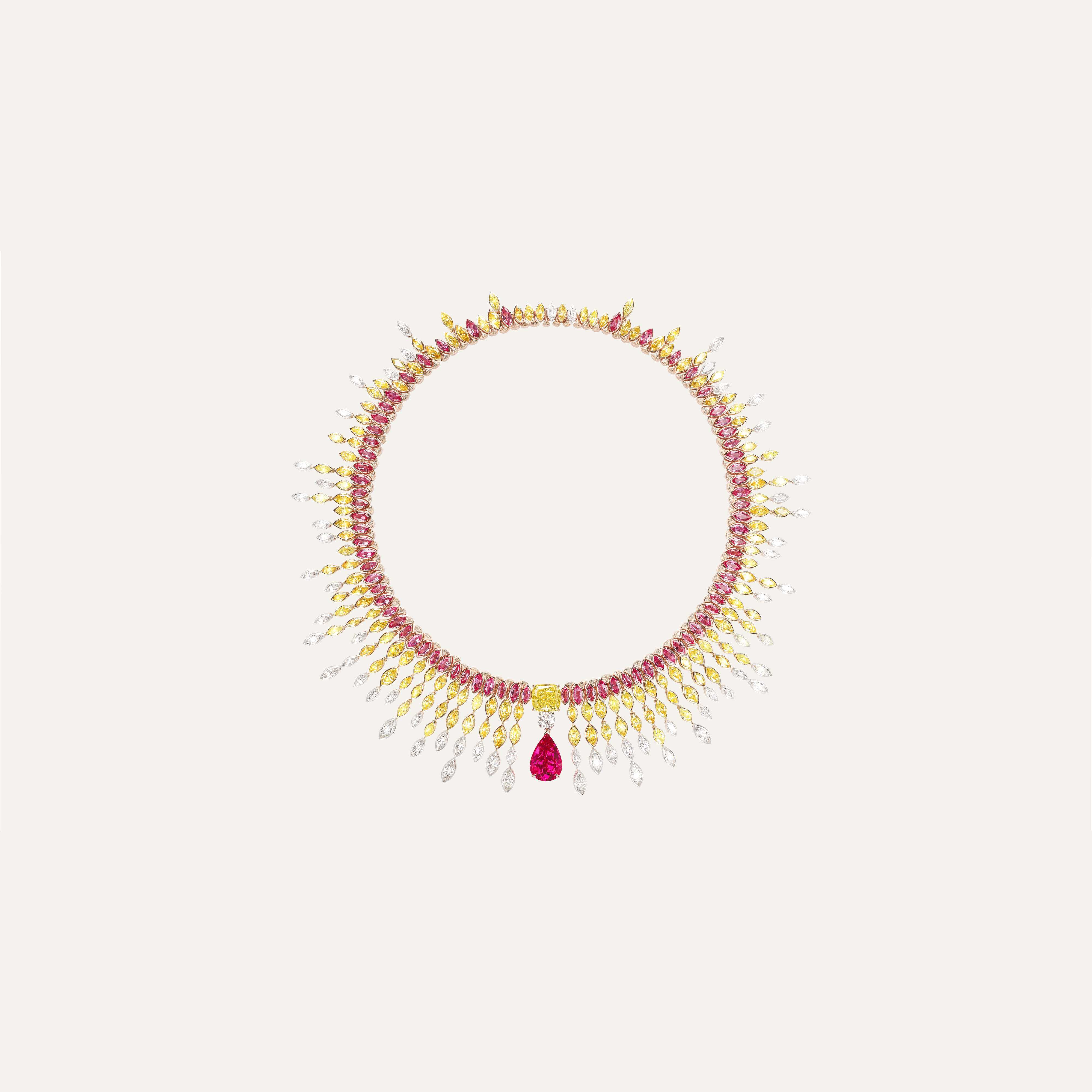 هذه القلادة من الذهب الوردي المرصعة بالياقوت الوردي تقفل كسلسلة السحّاب لتصبح سوارا.