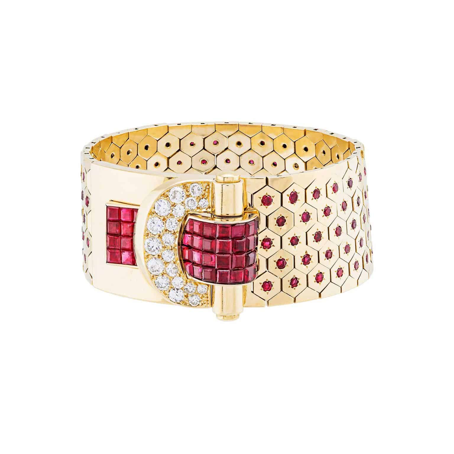 سوار لودو من الذهب الأصفر على شكل حزام يتميز بشبكته المرنة التي يتخللها مشبك مرصع بالروبي.