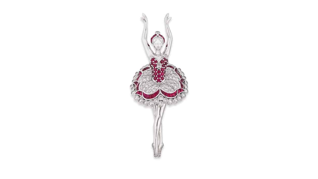 بروش الباليرينا من الذهب الأبيض والماس والزمرد. هذا البروش مستوحى من المرأة الأنثوية.