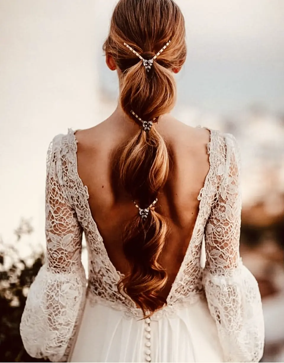 هل تشعرين بالراحة إذا قمت برفع شعرك والقيام بتسريحة ذيل الحصان؟ اذا لاتترددي في تجربتها في حفل زفافك للتمتع بمظهر شبابي أنيق، يمكنك إضافة بعض المجوهرات على طول الذيل.