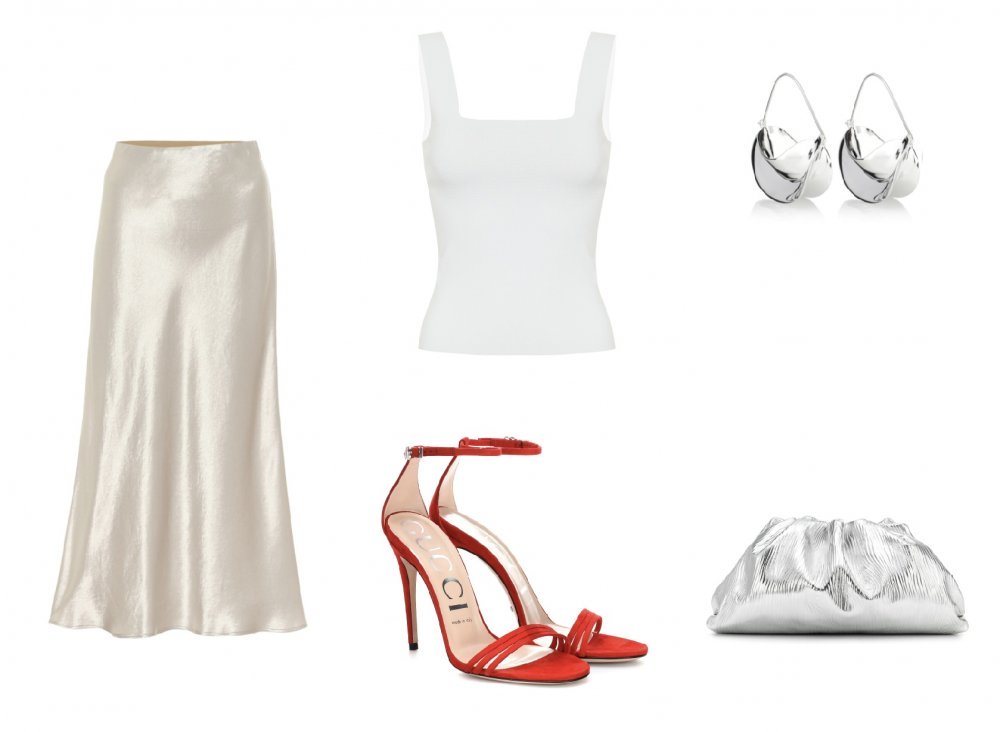 نسقي معه تنورة ميدي من ماكس مارا Max Mara بلون لؤلؤي من الساتان وأيضا توب من علامة Vince باللون الأبيض.