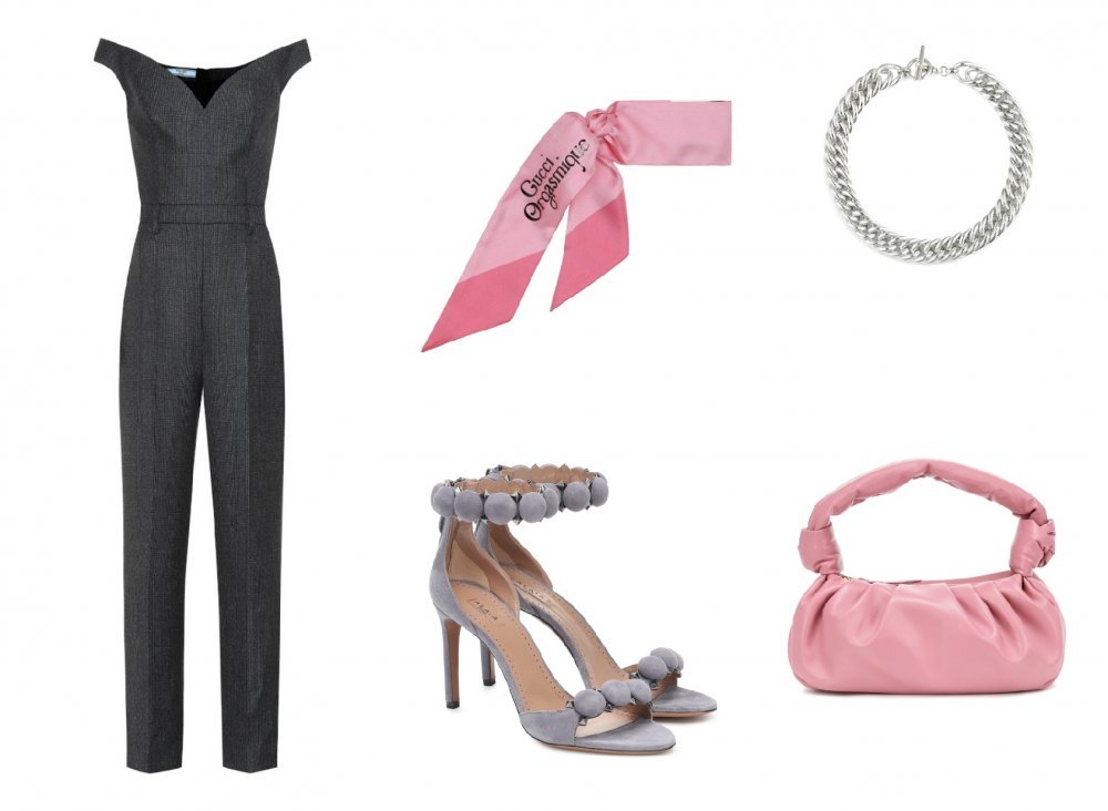اختاري صندل ذو لون رمادي مثل الخاص بعلامة الايا Alaia، وأضيفي له جمبسوت من علامة برادا Prada، وحقيبة يد من Miu Miu وسكارف من علامة غوتشي بتصميم ناعم.