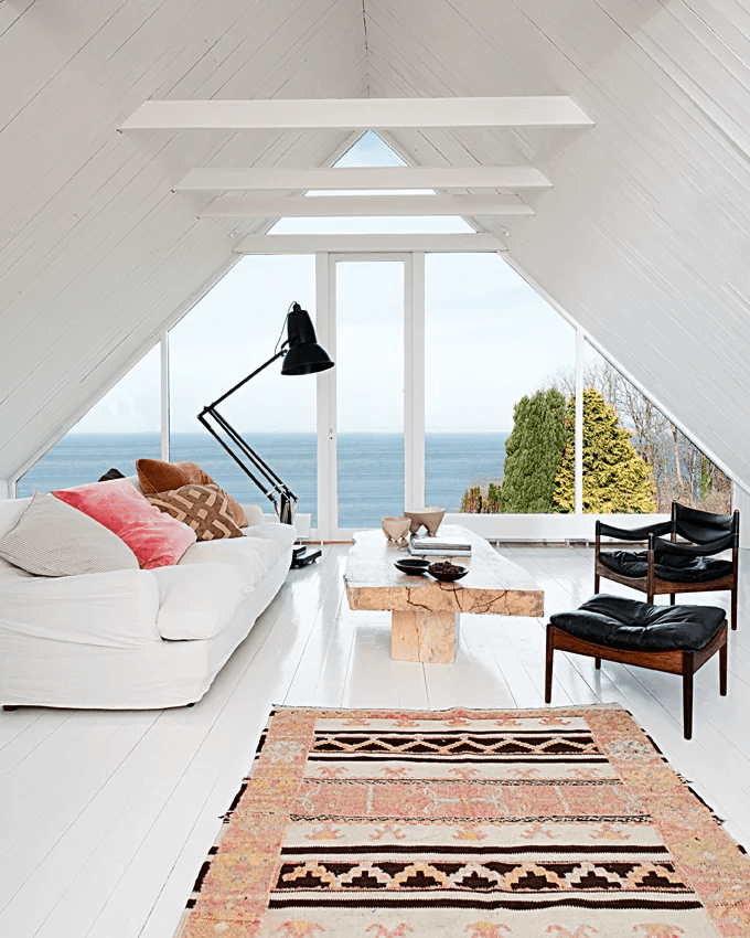ديكور صالون باللون الأبيض مع إطلالة بانوراميك.