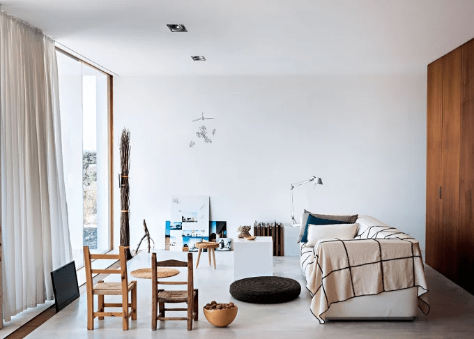 ديكور صالون باللون الأبيض مع لمسات منيمالية بسيطة.