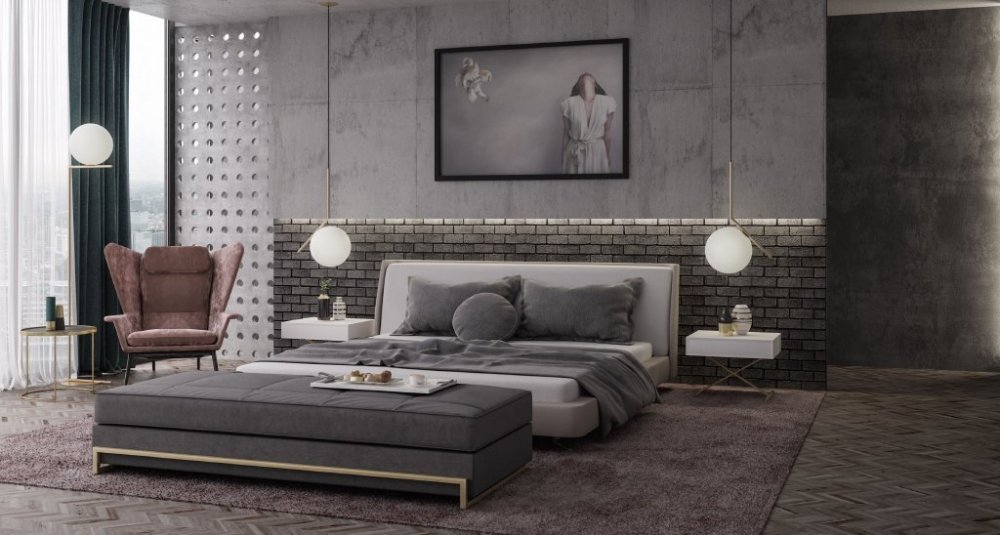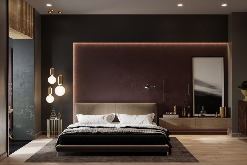 عند اختيارك لجدران غرفة النوم ننصحك بالمنجدة، لإضافة لمسة فخمة مفعمة بالترف مع الحفاظ على الأسلوب العصري الرائع لديكور الغرفة الداخلي.