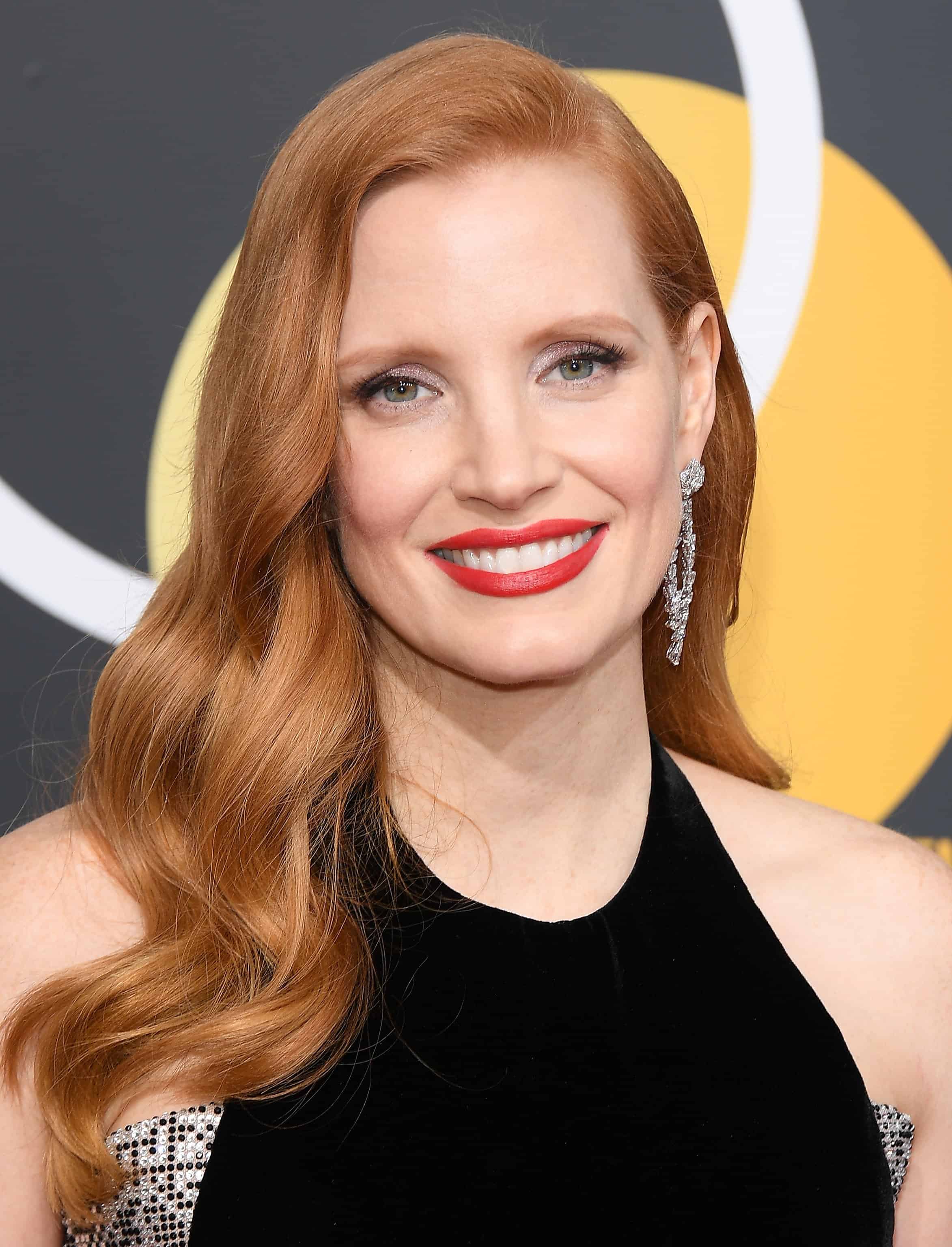 يرتكز مظهر جيسيكا شاستين على ظلال عيون وردية متلألئة وأحمر شفاه غامق.
