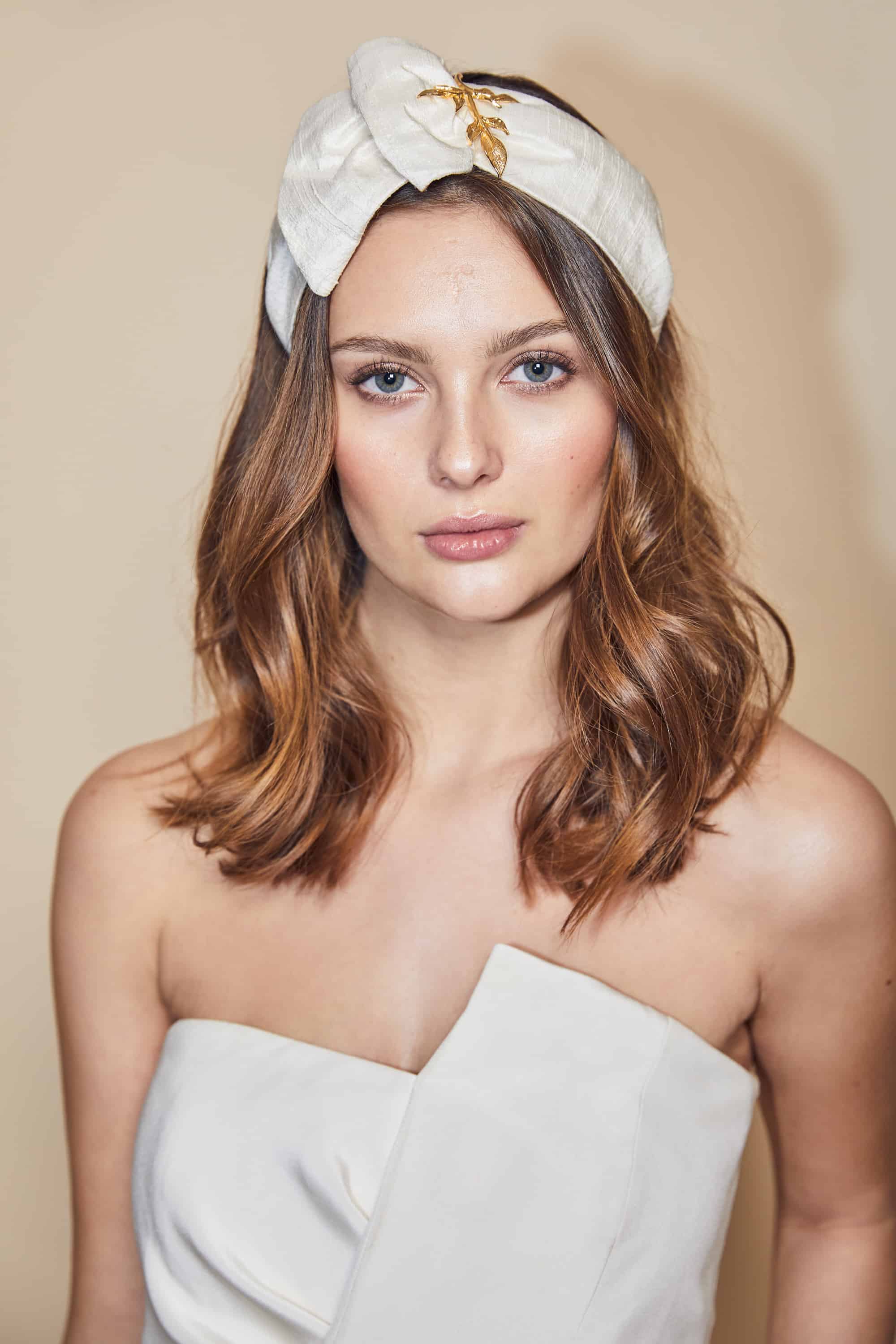 هذه العصابة الحريرية المصممة على شكل توربين مزين يدويا بورقة ذهبية عيار 14 قيراط مثالية للعروس الحديثة.