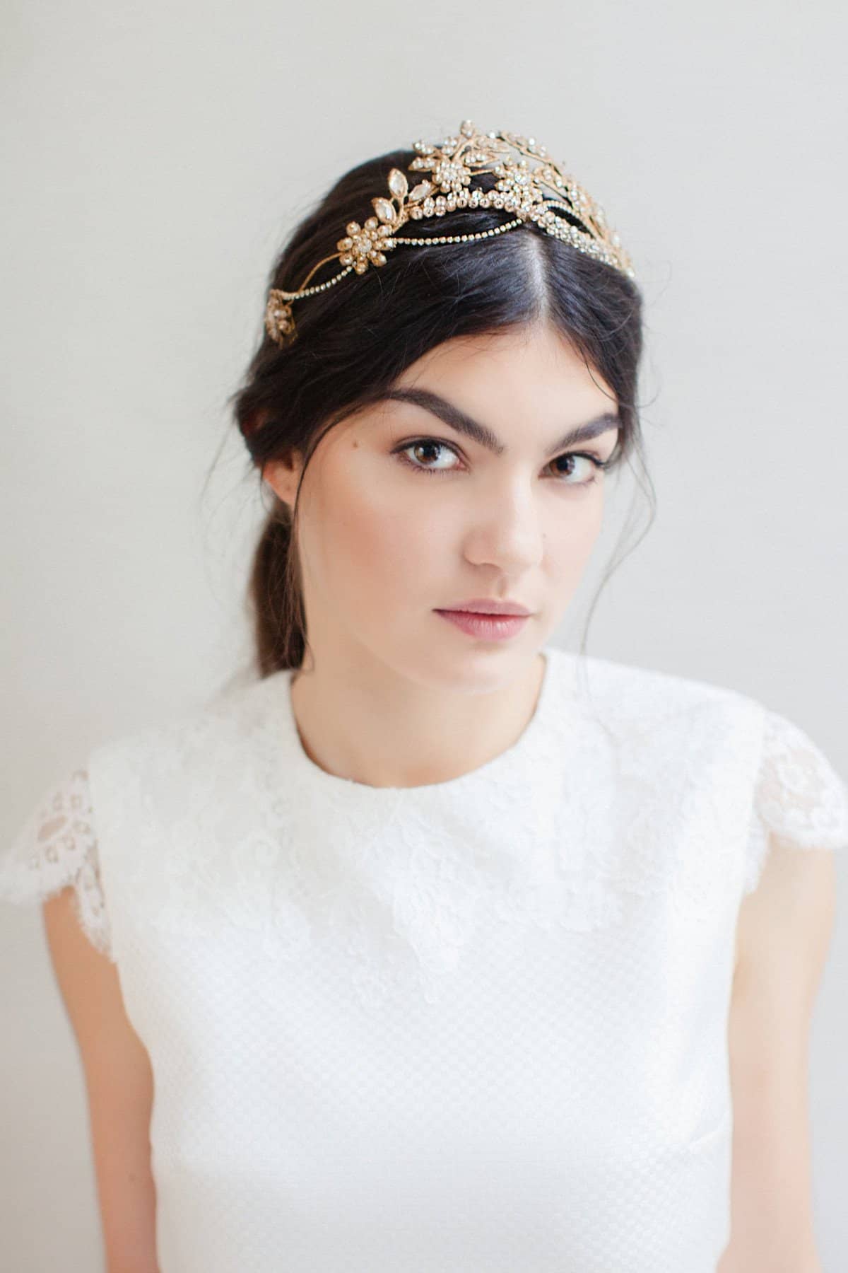 هذا التاج مزين بزهور من الدانتيل الفرنسي المزخرفة يدويًا بكريستالات بلورية فخمة.