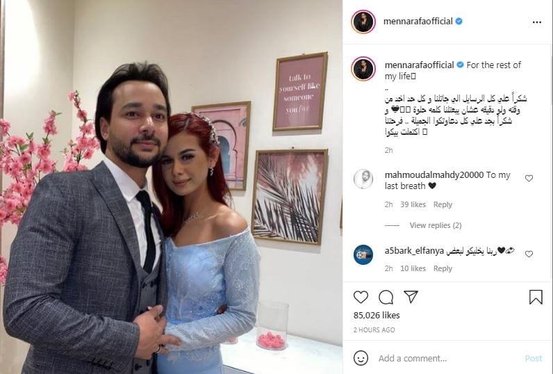 منة عرفة نشرت الصورة على حسابها الخاص على موقع الأنستغرام وقد أرفقتها بتعليق رومانسي “لبقية حياتي” ليرد عليها خطيبها بتعليق مماثل “لآخر أنفاسي”.