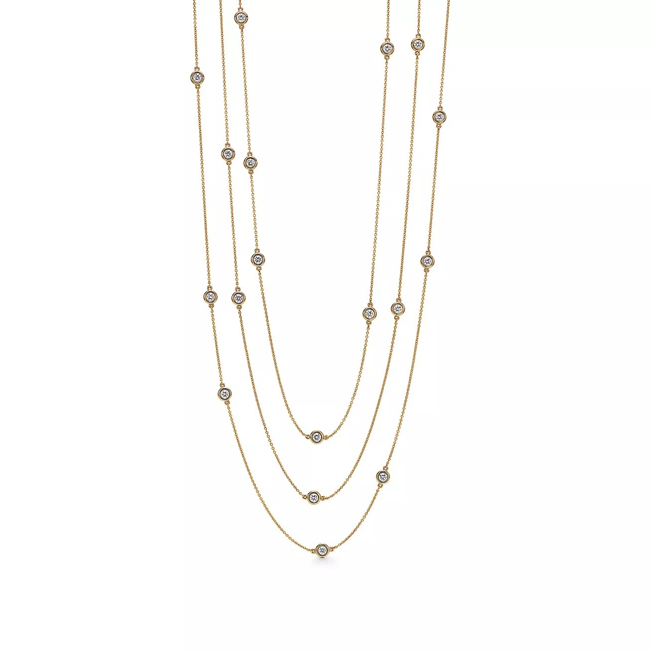 مجموعة من السلاسل الرفيعة المصنوعة من الذهب الأصفر تناسب صيحة التكديس، السلاسل مرصعة حبات دائرية من الماس الأبيض.