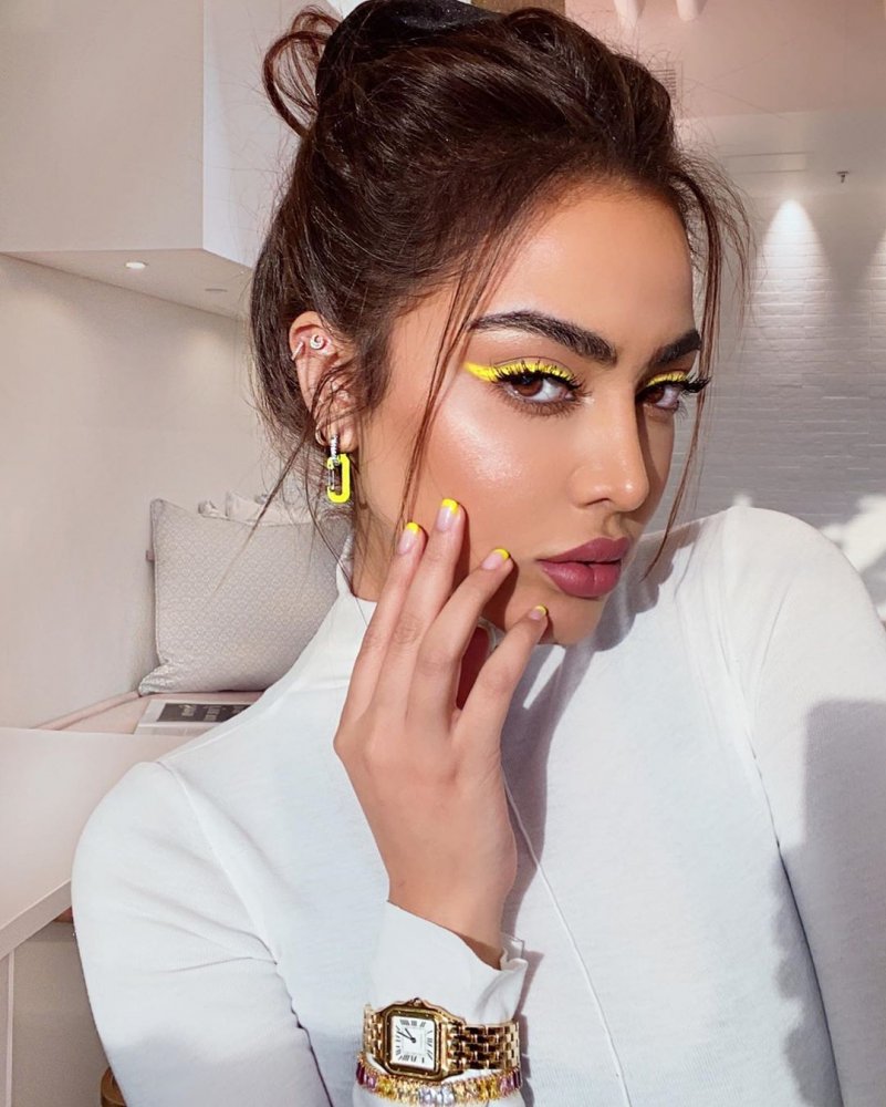 اعتمدت مدونة الموضة اللبنانية ناتالي فنج في إطلالة صباحية بأسلوب عصري الايلاينر الملون حيث قامت برسم خط كحل ملون باللون الأصفر.