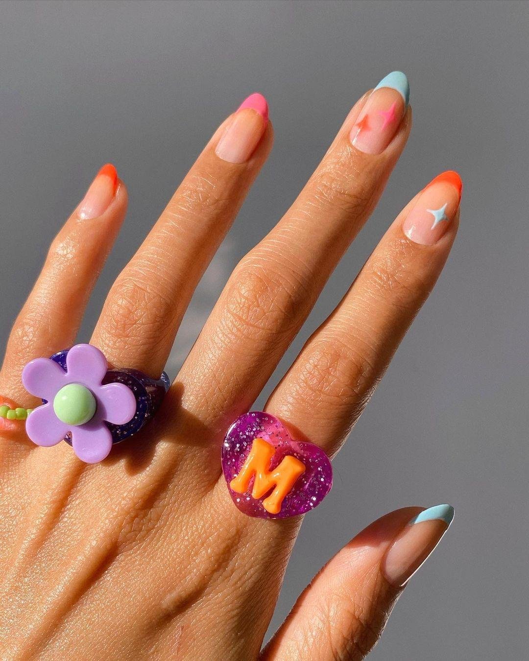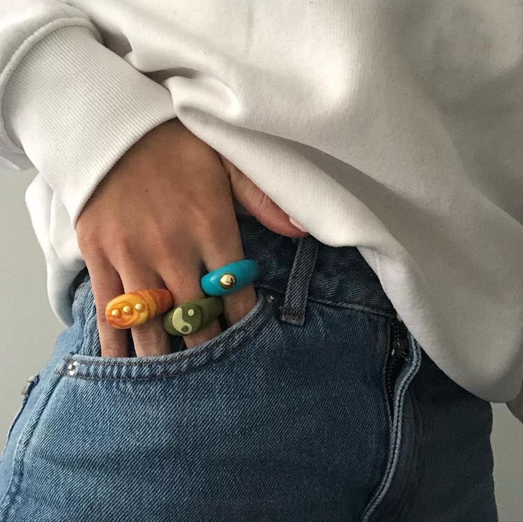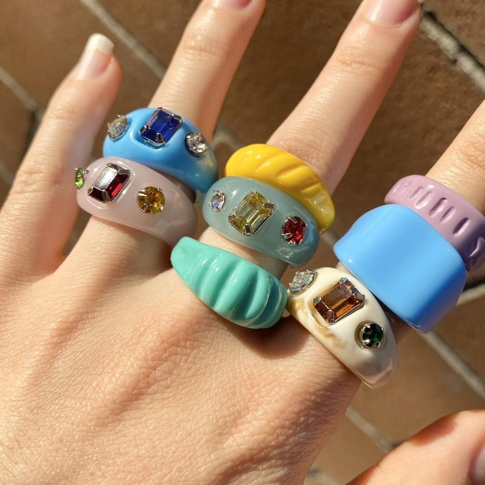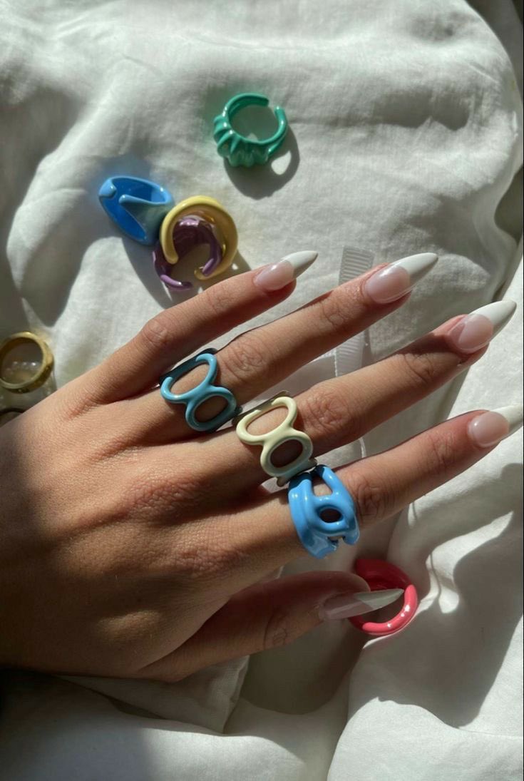 الخواتم الملونة المصنوعة من الأكريليك والزجاج والتي تم تصميمها من قبل أشهر العلامات التجارية مثل La Manso و BonBon Whims لإضافة الحيوية على يدي كل امرأة انتشرت بشكل ملحوظ في صيف 2021 لتتواصل الآن كأبرز وأغرب صيحات الموضة.