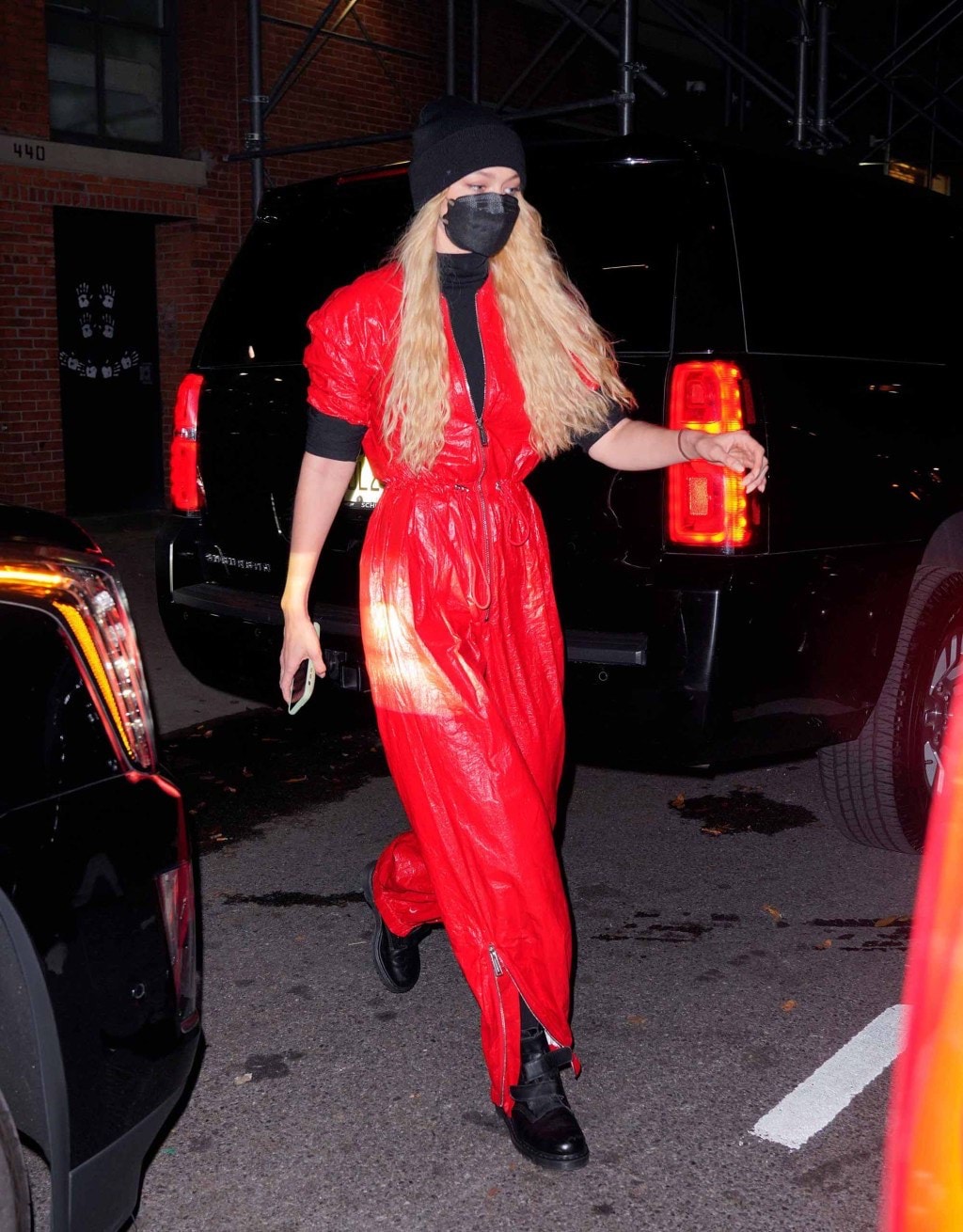 جيجي حديد أطلت بشكل أنيق حيث ارتدت جمبسوت باللون الأحمر البارز فيما كان الحذاء باللون الأسود بتصميم كاجوال يضمن لها الدفء.