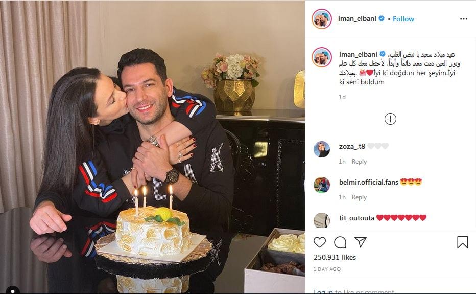 نشرت ملكة الجمال المغربية إيمان الباني صورة على حسابها الخاص على الانستغرام بمناسبة الاحتفال بعيد ميلاد زوجها الممثل التركي مراد يلدريم.